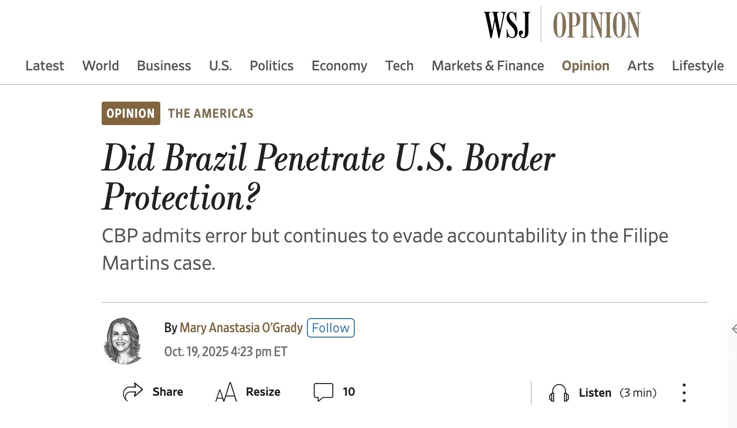 Um artigo da colunista Mary Anastasia O’Grady publicado neste domingo (19) pelo jornal The Wall Street Journal levanta abertamente a hipótese de que o sistema da Alfândega e Proteção de Fronteiras dos Estados Unidos (Customs and Border Protection ou CBP, na sigla em inglês) pode ter sido alvo de uma invasão de autoridades brasileiras.